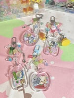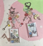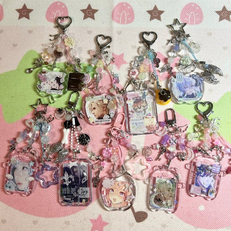 the keychains contain glass & plastic beads/charms. frame can be chosen in the variant options^^ stickers can be put either inside or outside.